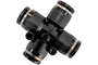 Цанговое соединение X-образной формы применяется при создании пневматических магистралей и для монтажа пневмосистем. Обеспечивает полностью герметичное соединение различных пневматических шлангов без повреждения их поверхности (PU, PE, PA) - полиуретановых, полиэтиленовых, полиамидных и пр. Простой и быстрый принцип работы цангового зажима позволяет одной рукой присоединять шланги. Для этого необходимо всего лишь вставить шланг в фитинг с небольшим усилием. Извлечь его можно просто нажав на специальную кнопку-кольцо вокруг шланга в сторону фитинга, при этом цанга разожмется и шланг можно легко вынуть из фитинга. Высокая прочность материалов изготовления, компактные размеры, качественные уплотнительные кольца, все это позволяет использовать данные цанговые соединения в различных сферах промышленности и пр. Корпус выполнен из прочного к механическим повреждениям технополимера, зубчатый цанговый зажим из нержавеющей стали, а уплотнительные кольца из эластомера.