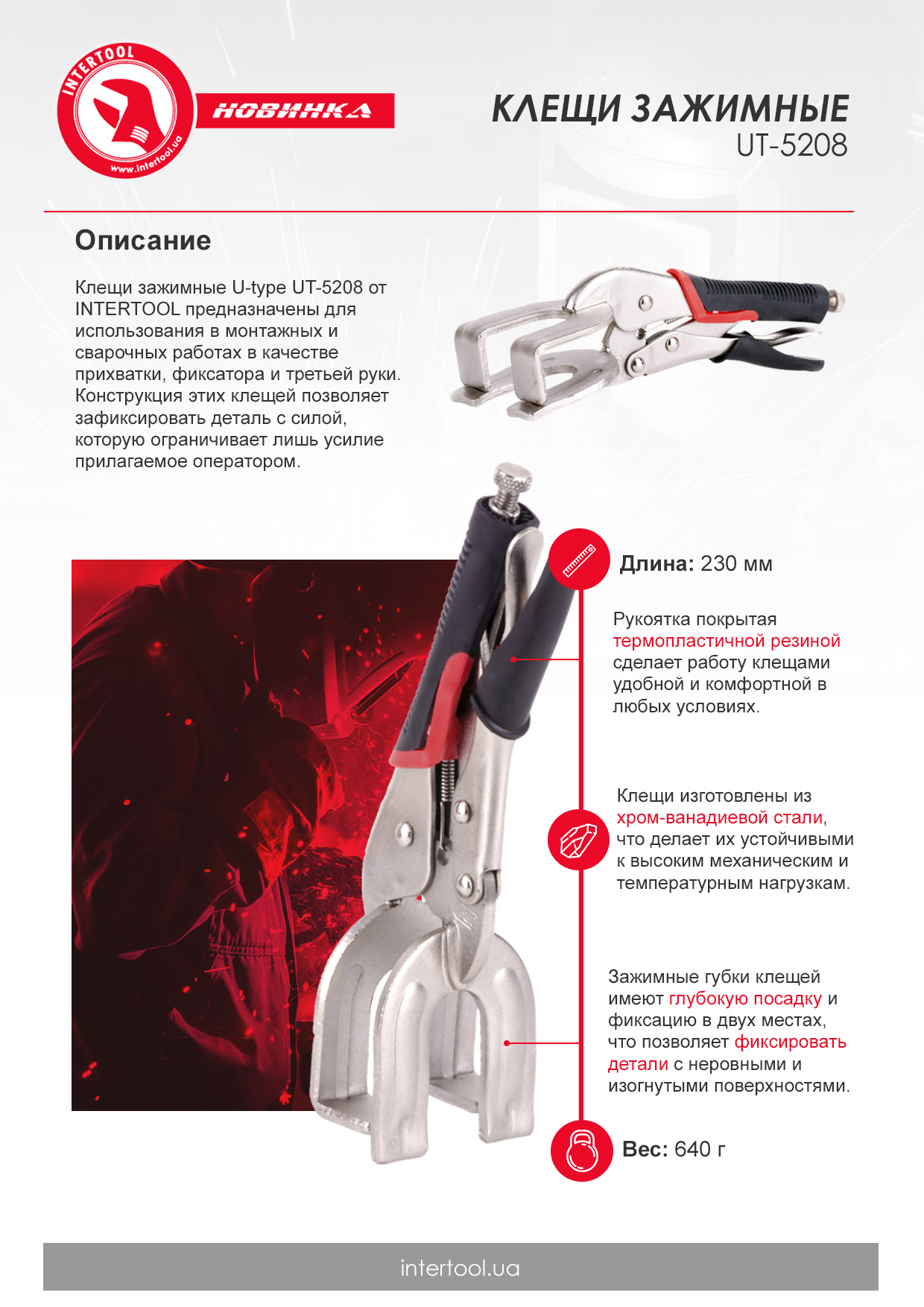 Клещи зажимные U-type INTERTOOL HT-5208 предназначены для использования в монтажных и сварочных работах в качестве прихватки, фиксатора и третьей руки.