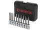 Набор насадок TORX в держателе предназначен для монтажа и демонтажа крепежей с типом шлица: T20, T25, T27, T30, T40, T45, T50, T55, T60. Данный комплект сменных бит подходит для использования совместно с трещоточными рукоятками и держателями, с посадочным квадратом 1/2". Удлиненные биты 100 мм позволяют эффективно работать в труднодоступных местах и гарантируют надежное сцепление со шлицом крепежа. Насадки изготовлены из топовой закаленной стали, самого высокого качества марки S2. В составе этой стали присутствуют молибден и кремний, которые придают изделию высокое сопротивление к нагрузкам и низкий порог обратимой деформации. Сами головки изготовлены из прочной Cr-V стали, такое сочетание делает инструмент надежным, прочным, обладающим большим ресурсом работы. Весь набор помещен в прочный пластиковый кейс с металлическими защелками, стильного дизайна серии STORM. Металлические замки уберегут кейс от случайного открытия. Ящик легко переносить и хранить, он компактный и не занимает много места.
